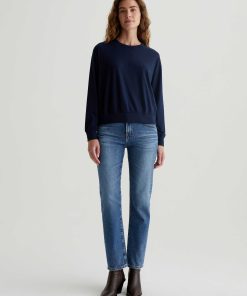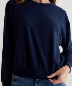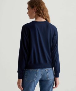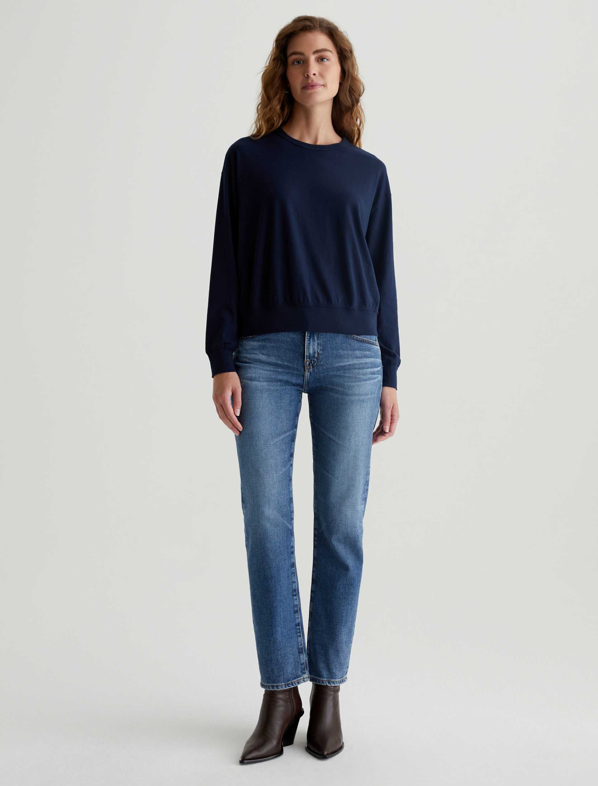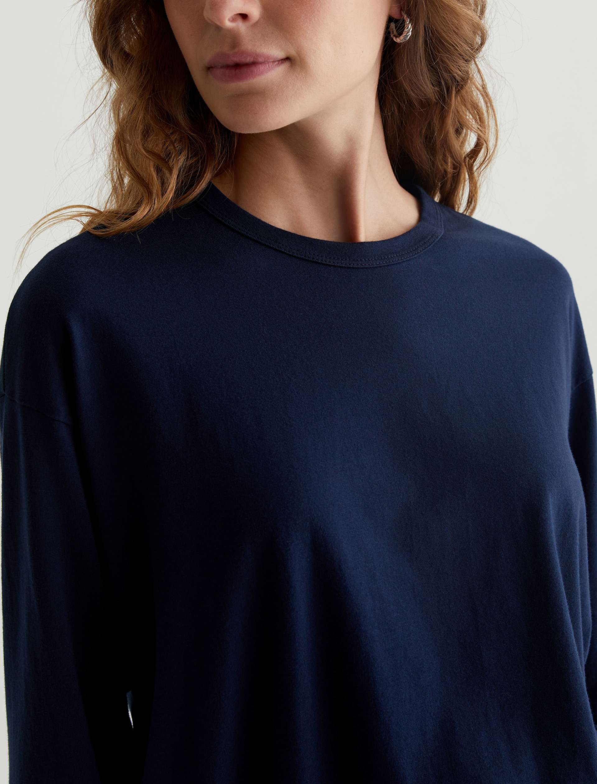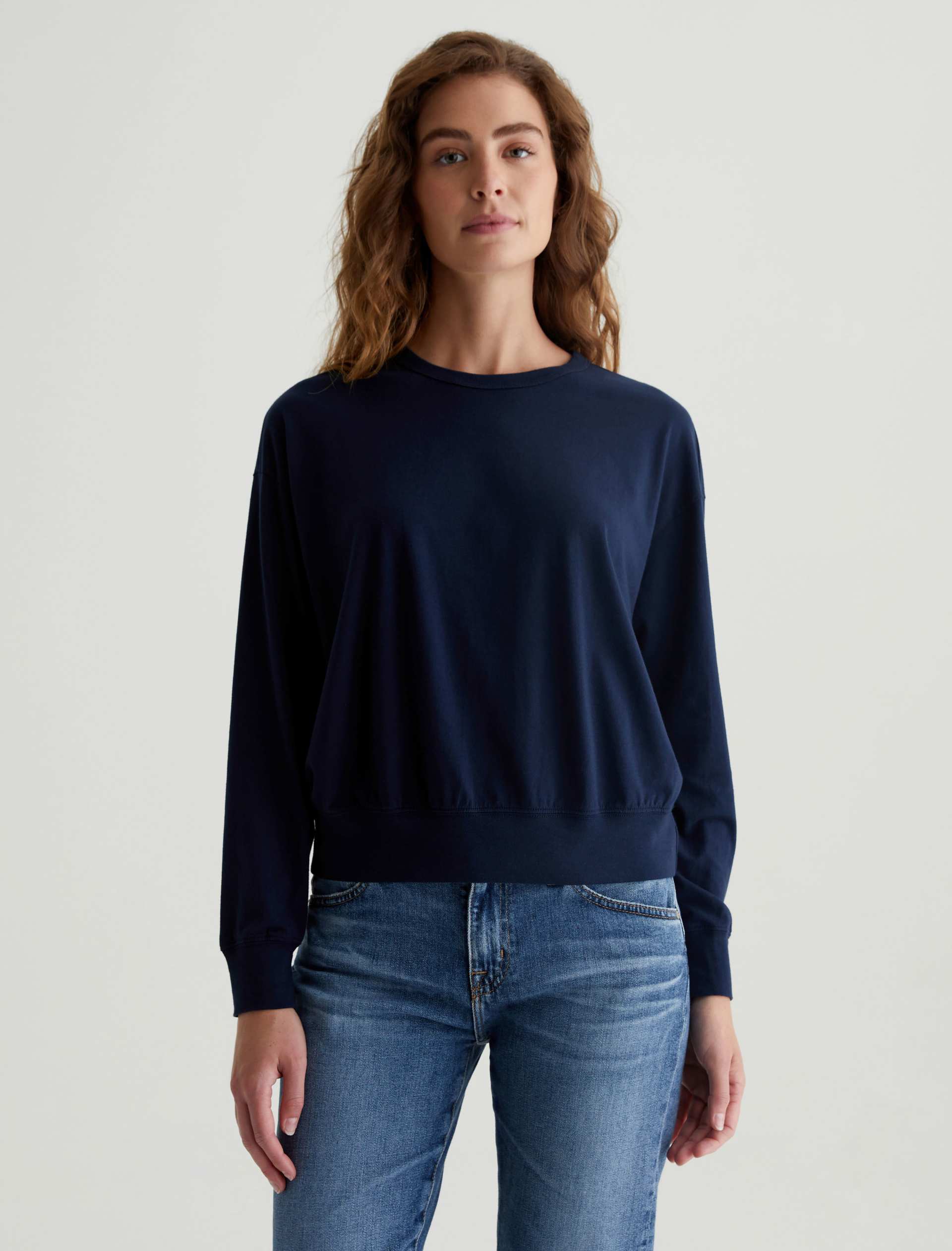 The Karter Pullover in deep navy is a new silhouette in our Basic Essentials collection. We borrowed the details of a sweatshirt including the rib binding, cuff, and bottom hem to make a great lightweight pullover. Our Jersey Knit offers a luxurious comfort that is unrivaled—knitted with both S-twist and Z-twist yarn t