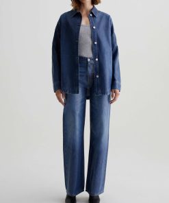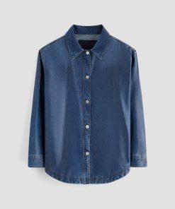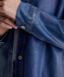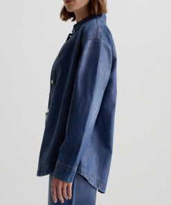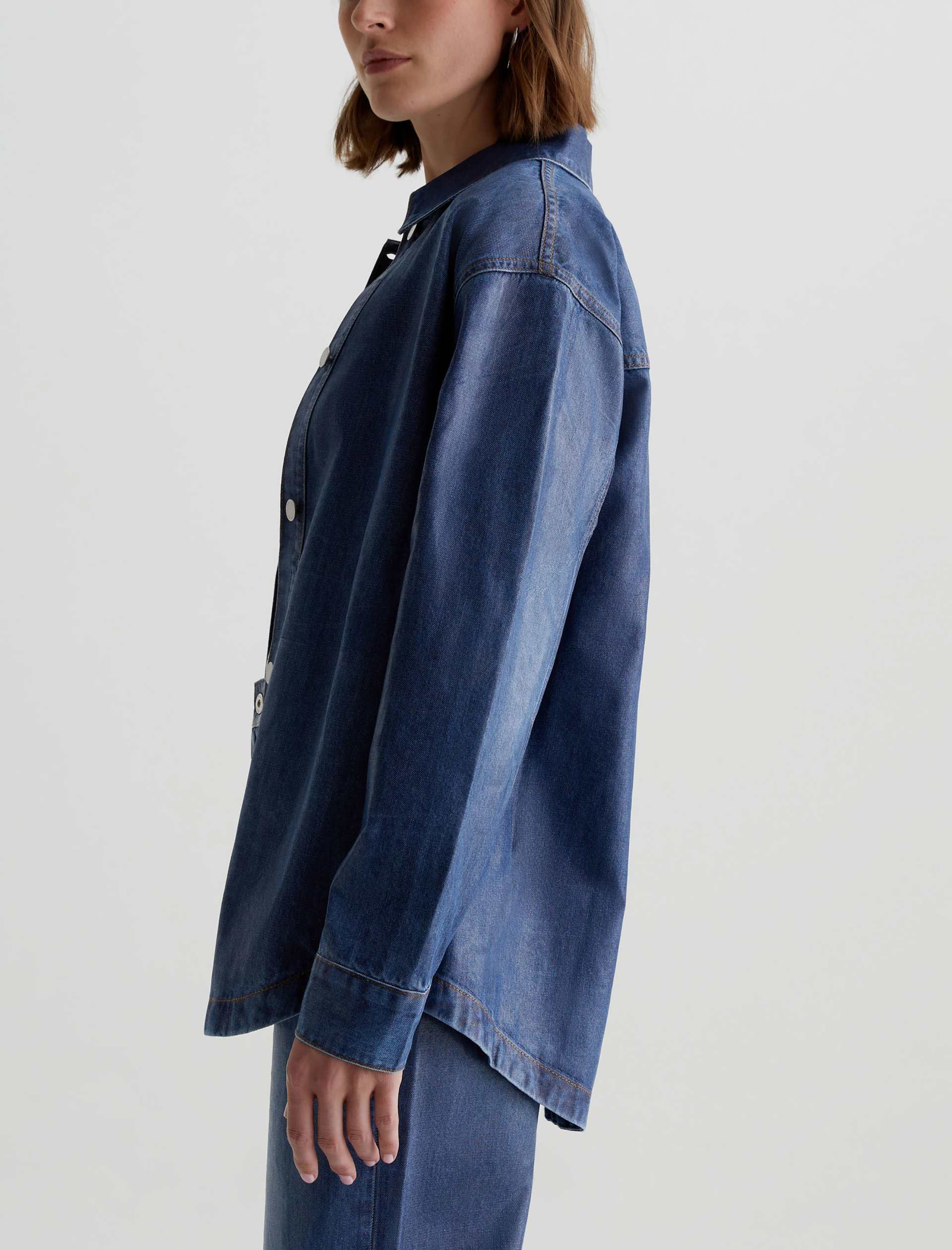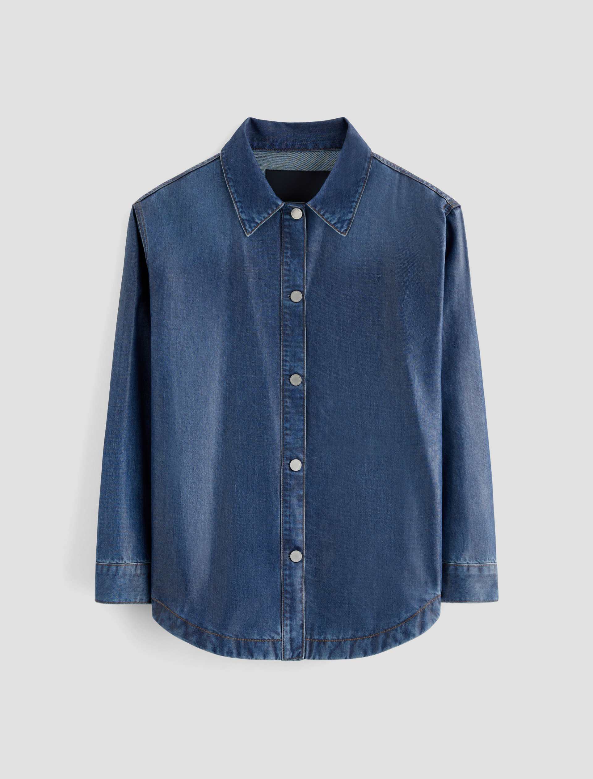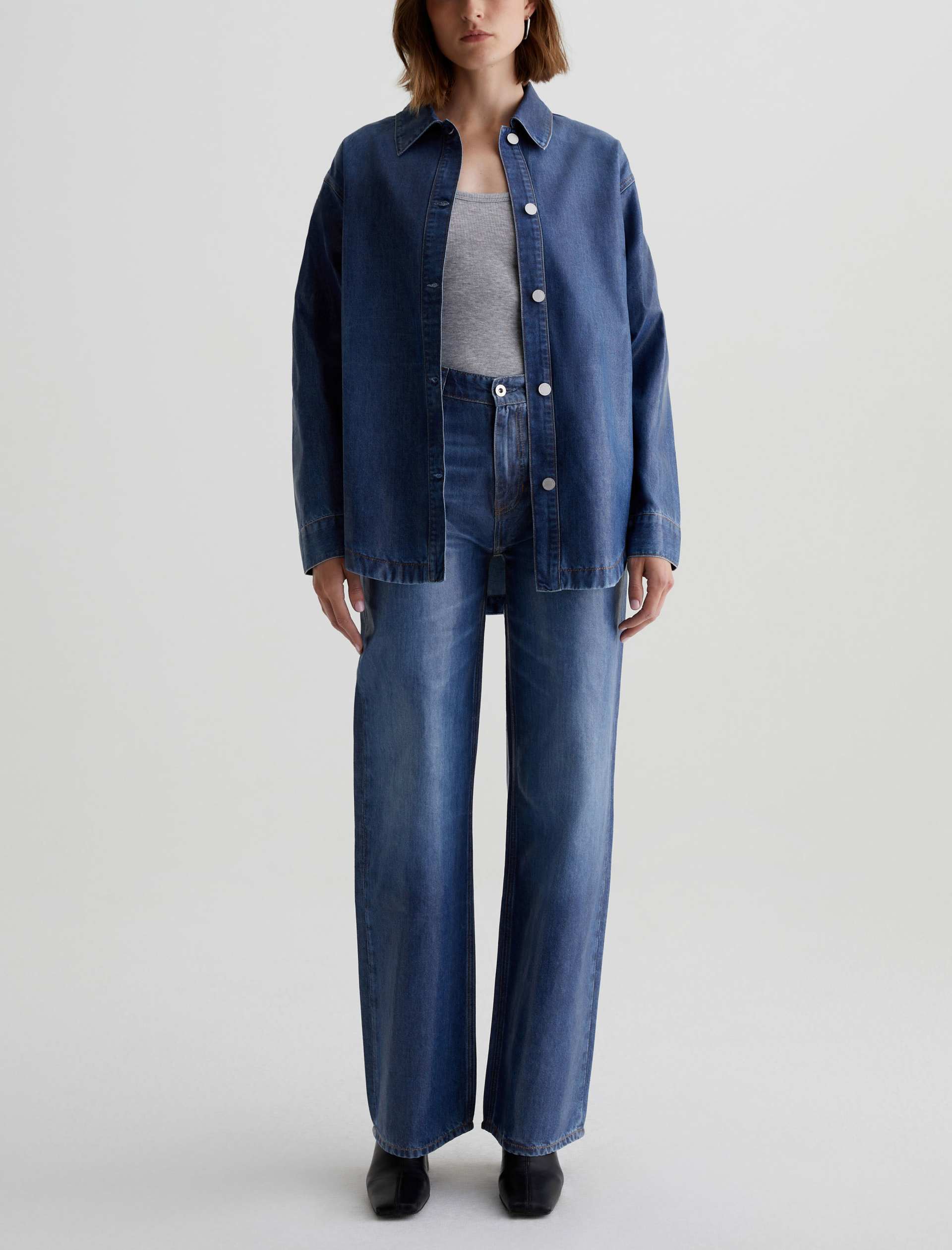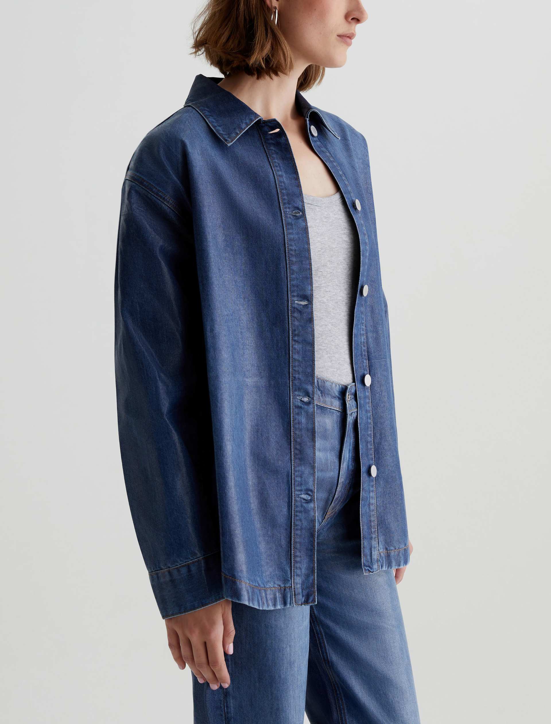 Glazed denim makes the Kea Jacket a statement piece. Part shirt, part jacket—it’s an easy, oversized shirt jacket in our Liquid Lyocell Denim. The soft cotton blend is washed to a faded blue shade and glossed with a clear coating for a shiny water-repellent finish.
