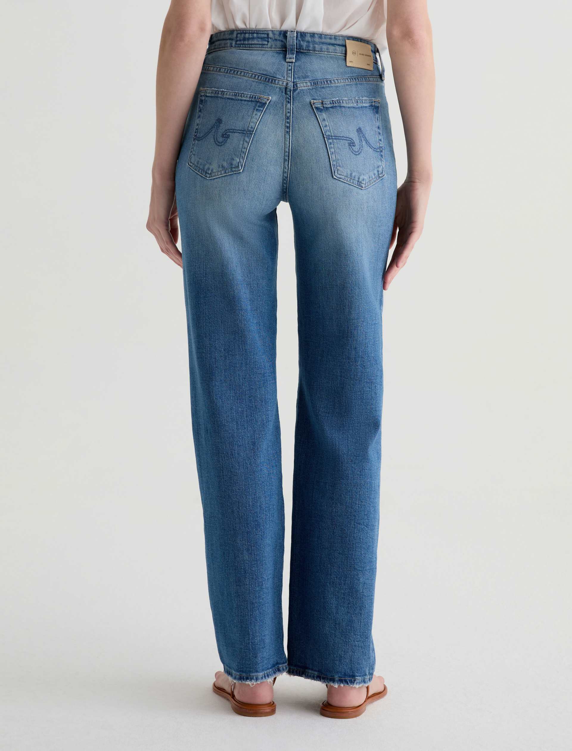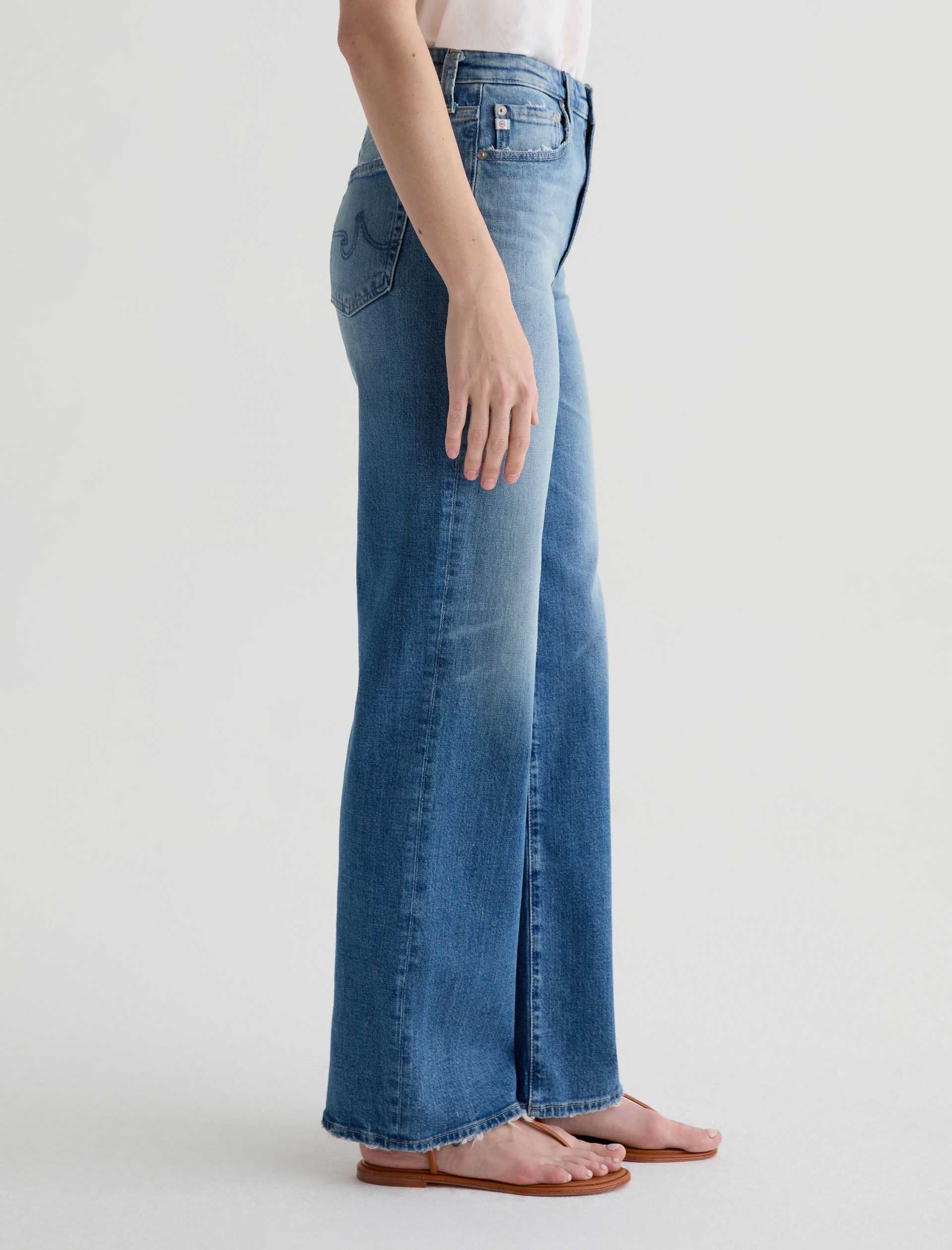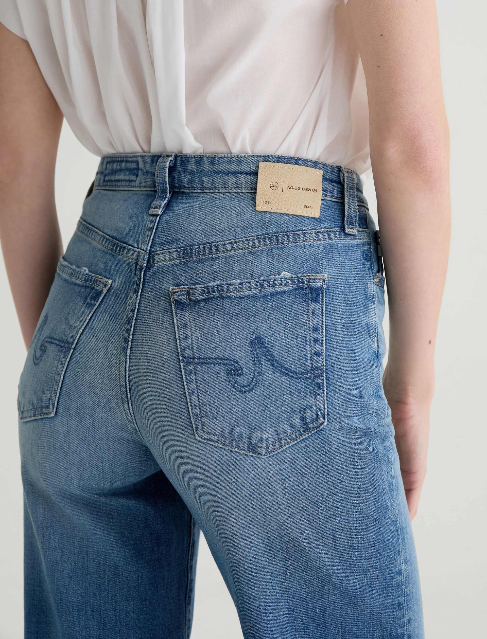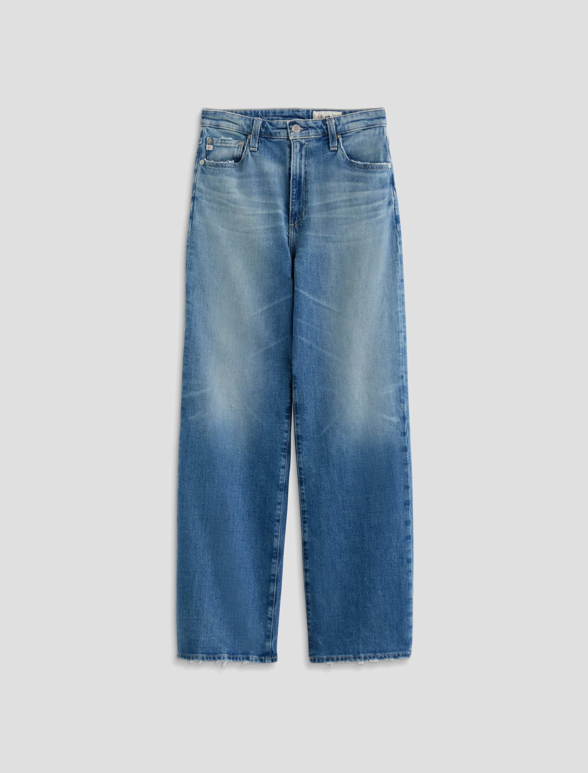 The Kora jean is a high-rise style with a 32” inseam and a subtly wide-leg feel throughout. Made from Italian 11 oz. Journey Denim, its medium wash is AG-ed™ to resemble 13 years of wear.