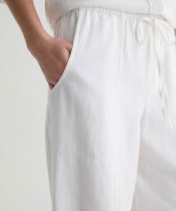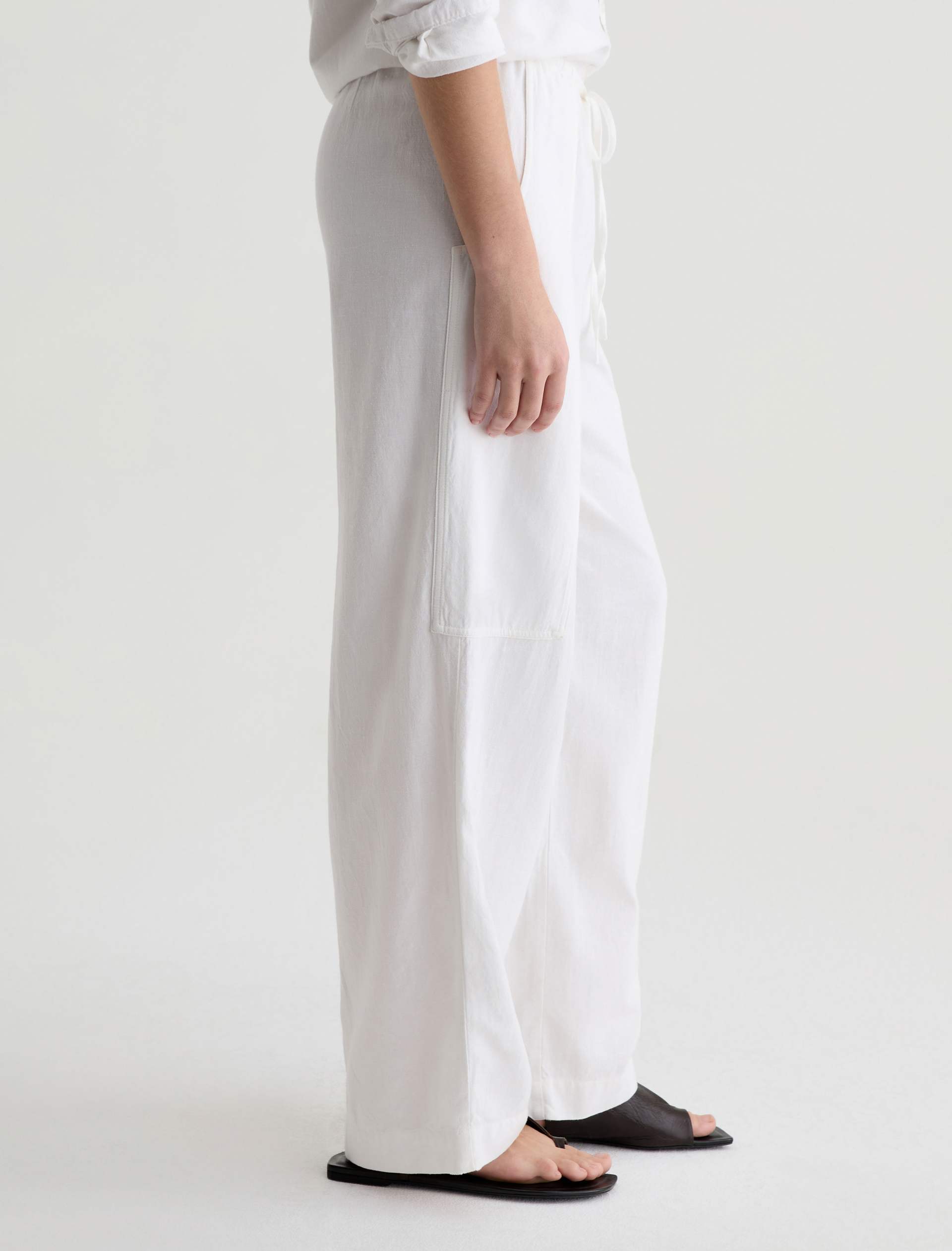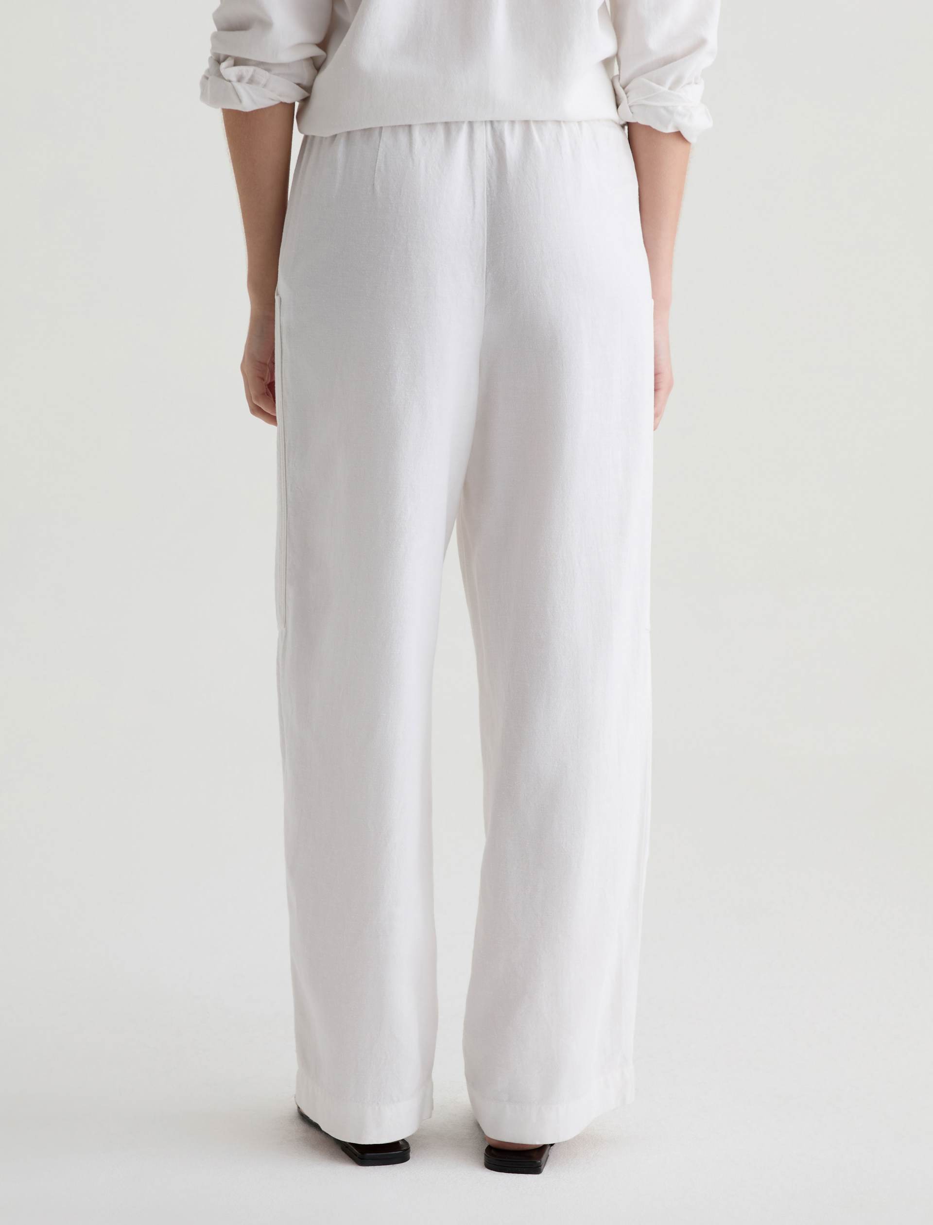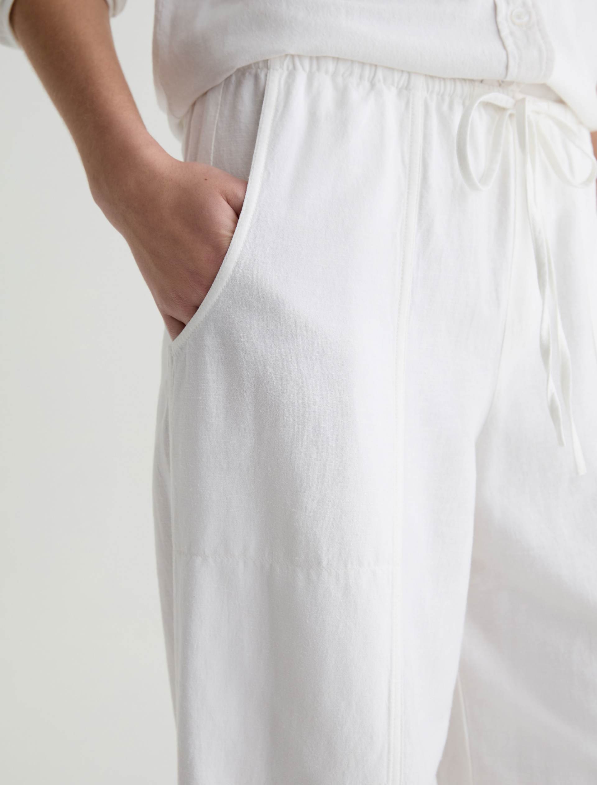 Nina is a white, high-rise, wide-leg, pull-on silhouette, crafted from a lightweight linen for a soft, fluid feel all season long. Effortlessly comfortable.