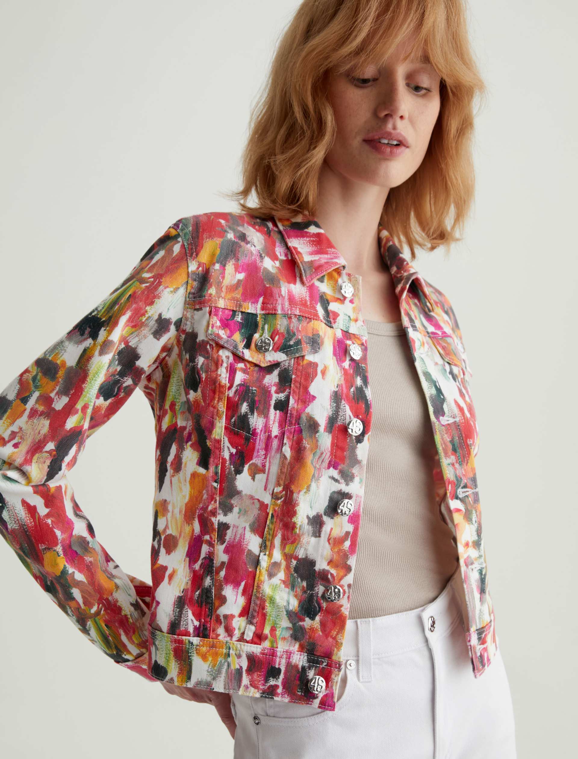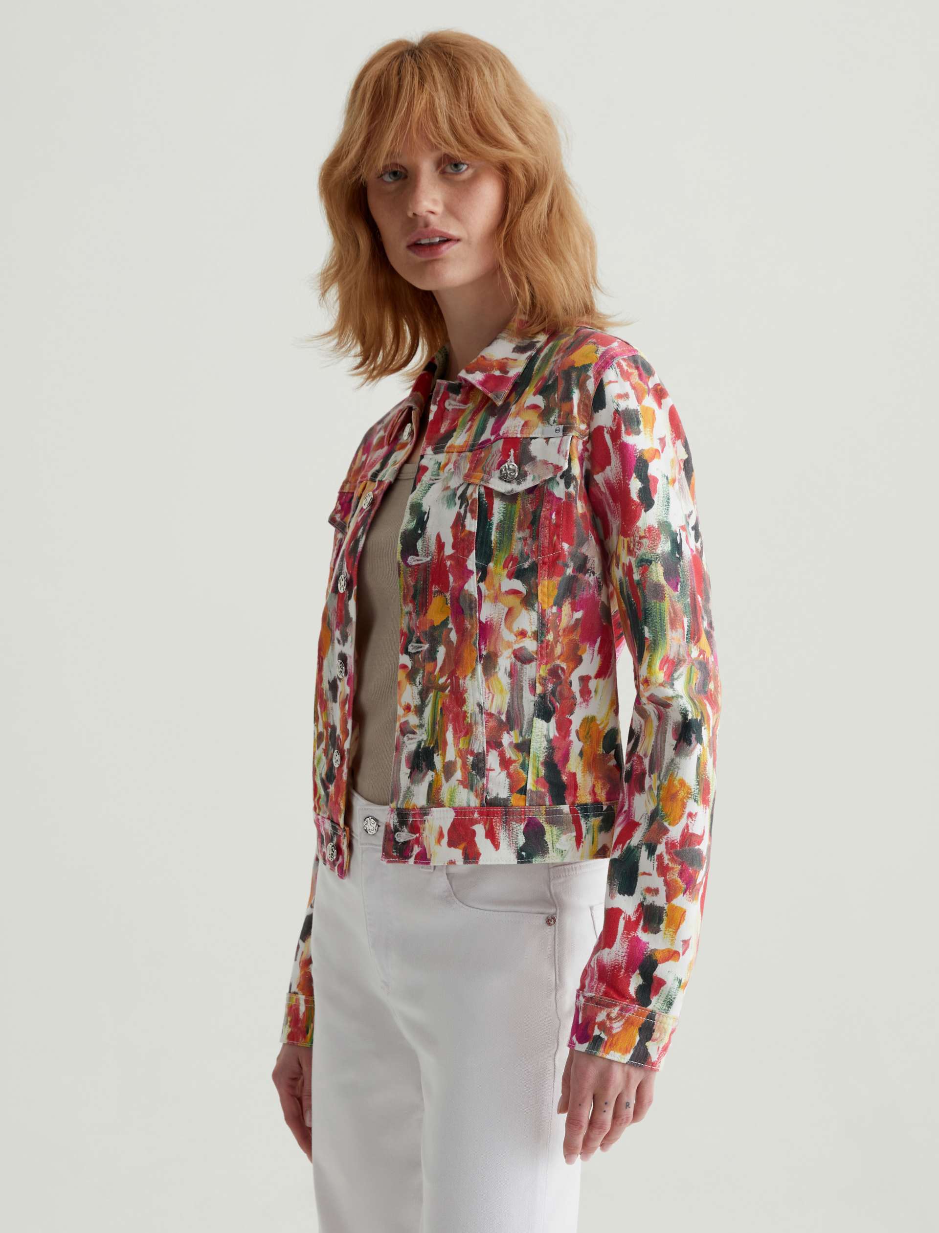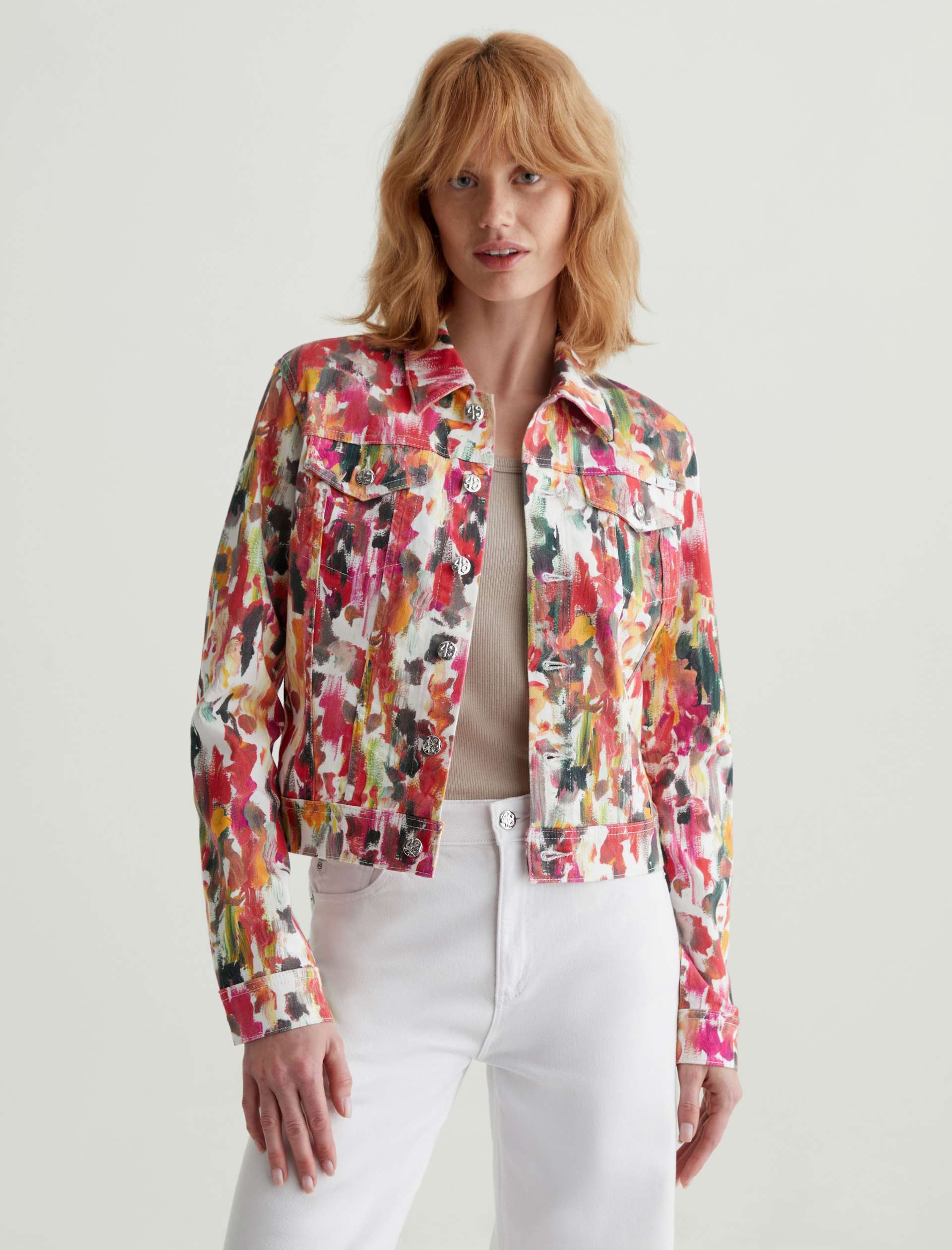 The Robyn Jacket is a women’s trucker with a slim fit, flap pockets, and sturdy metal hardware. It’s crafted from 10 oz. Superior Stretch Twill for a comfortable feel. About the Art Project print: This original design features an Impressionist-inspired look in a rich palette of red, magenta, green, and gold. Short, qui