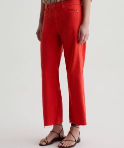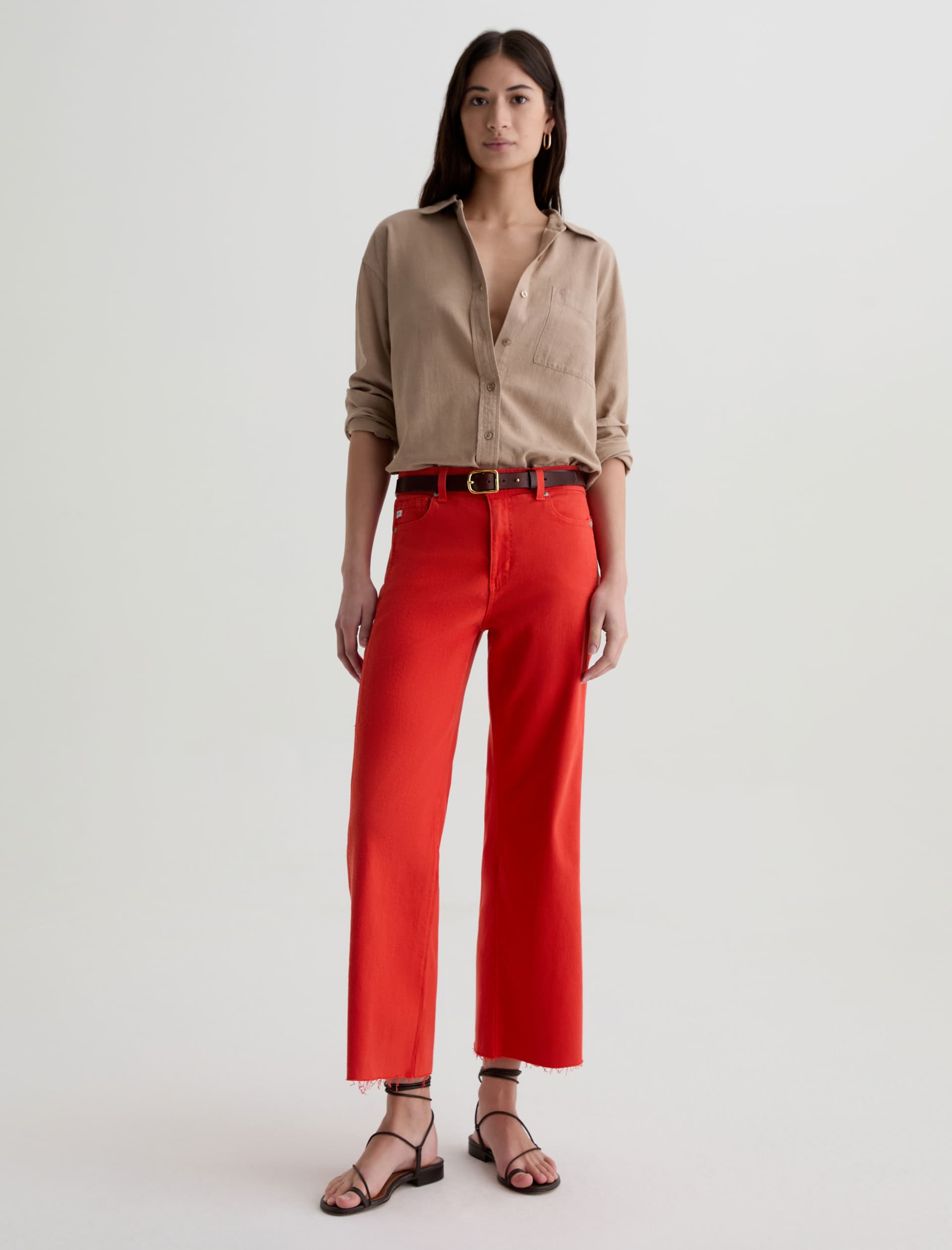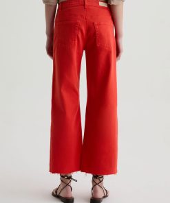 The Saige Wide-Leg Crop with Panel is a mid-rise style with a 27” inseam. Crafted from Japanese comfort stretch denim in a burnt orange hue, it features side panels that connect to the pocket scoop, giving it a more streamlined look.