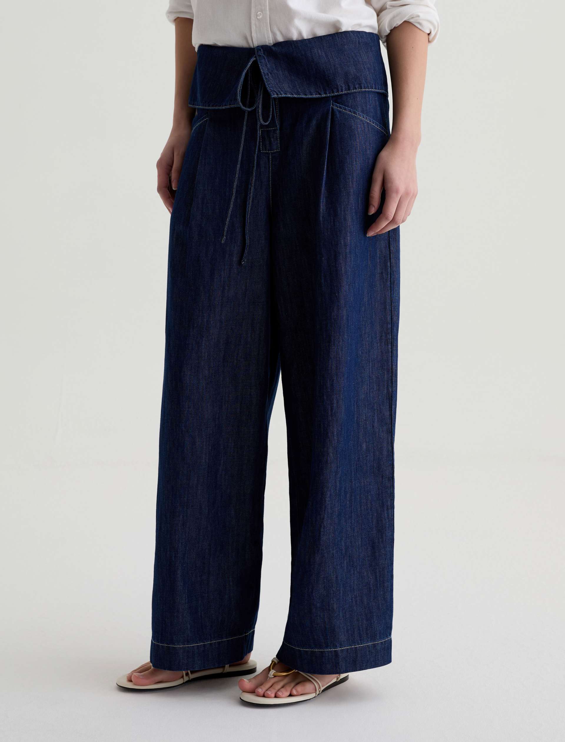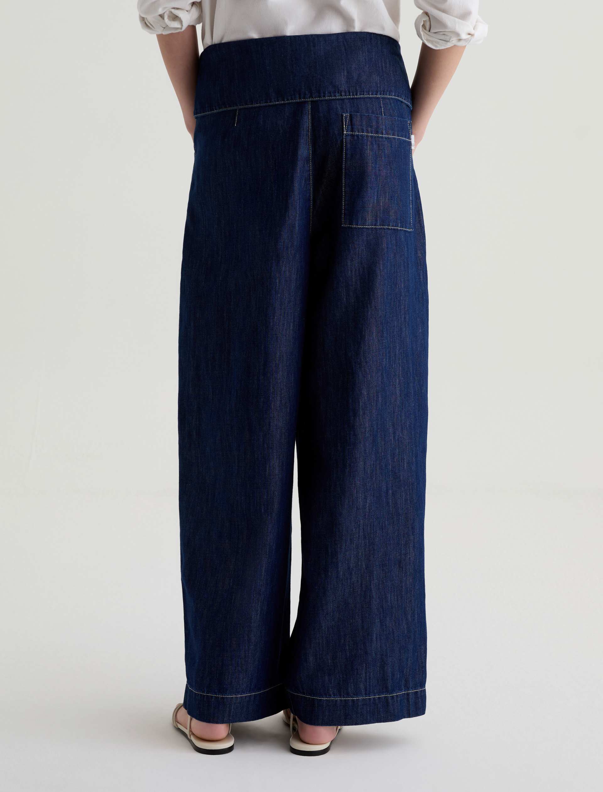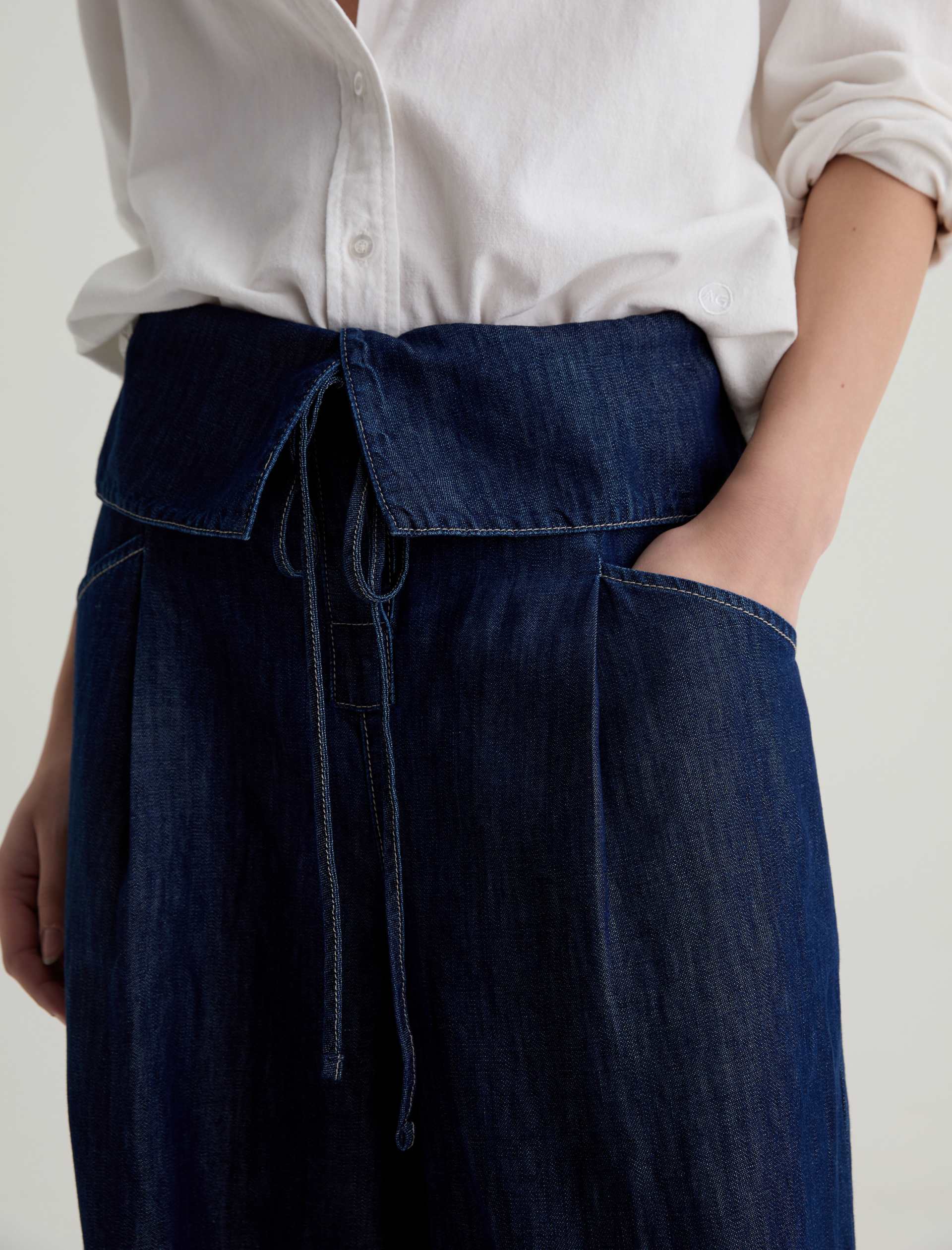 Shelvy is a Thai-inspired fisherman-style pant in Scarlett Irisblue Chambray, a blue wash that brings a relaxed, lived-in feel. Designed with a 26" inseam, it features a drawcord channel with a wide self-tie, a fold-over waistband, and a wide-turned hem for a relaxed yet polished look. Crafted for warm-weather lounging