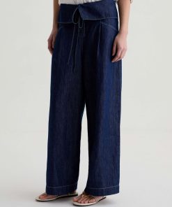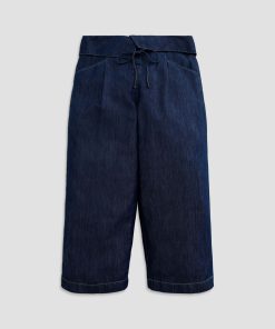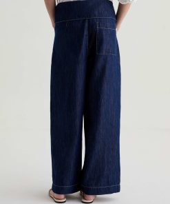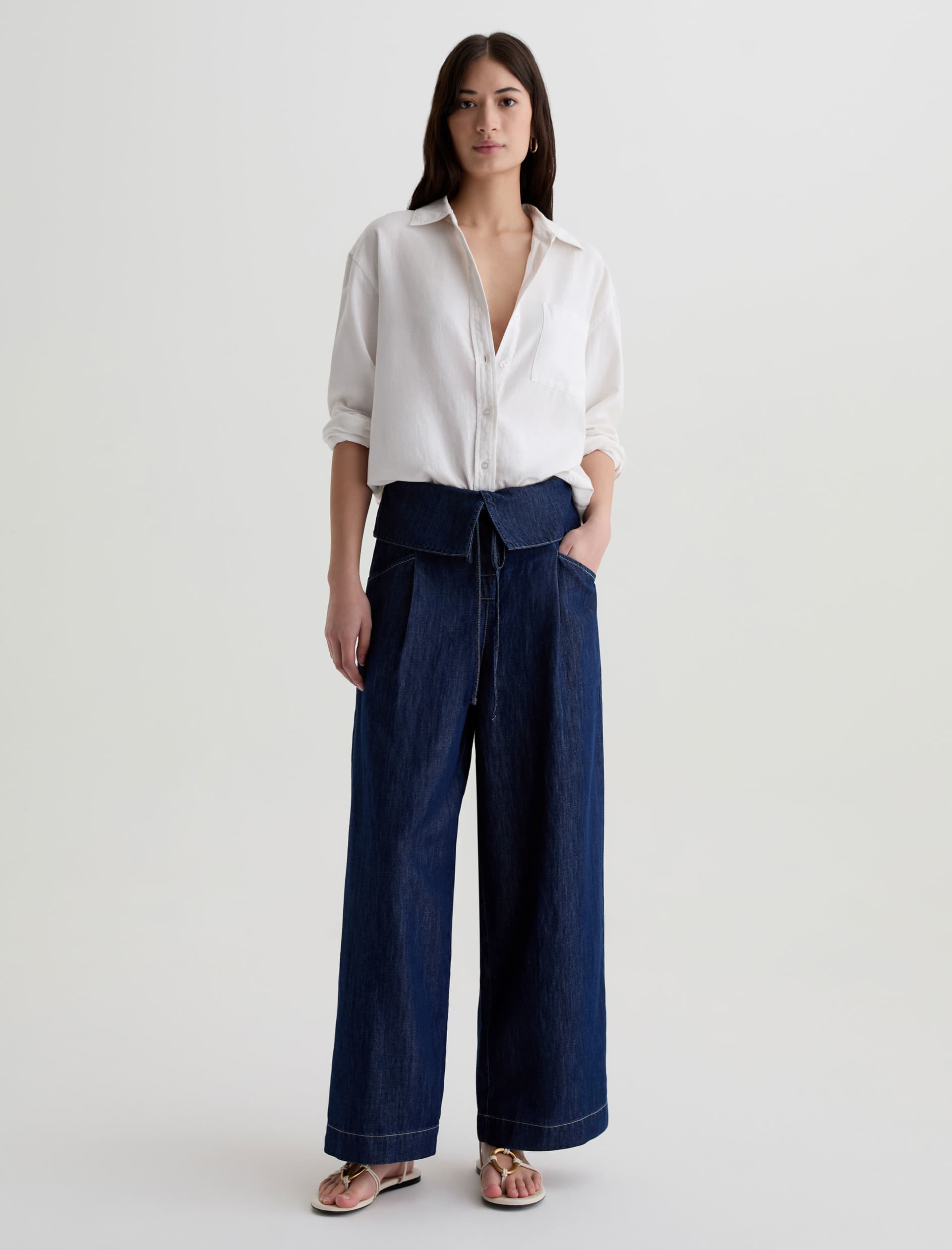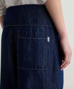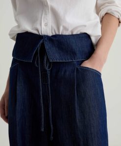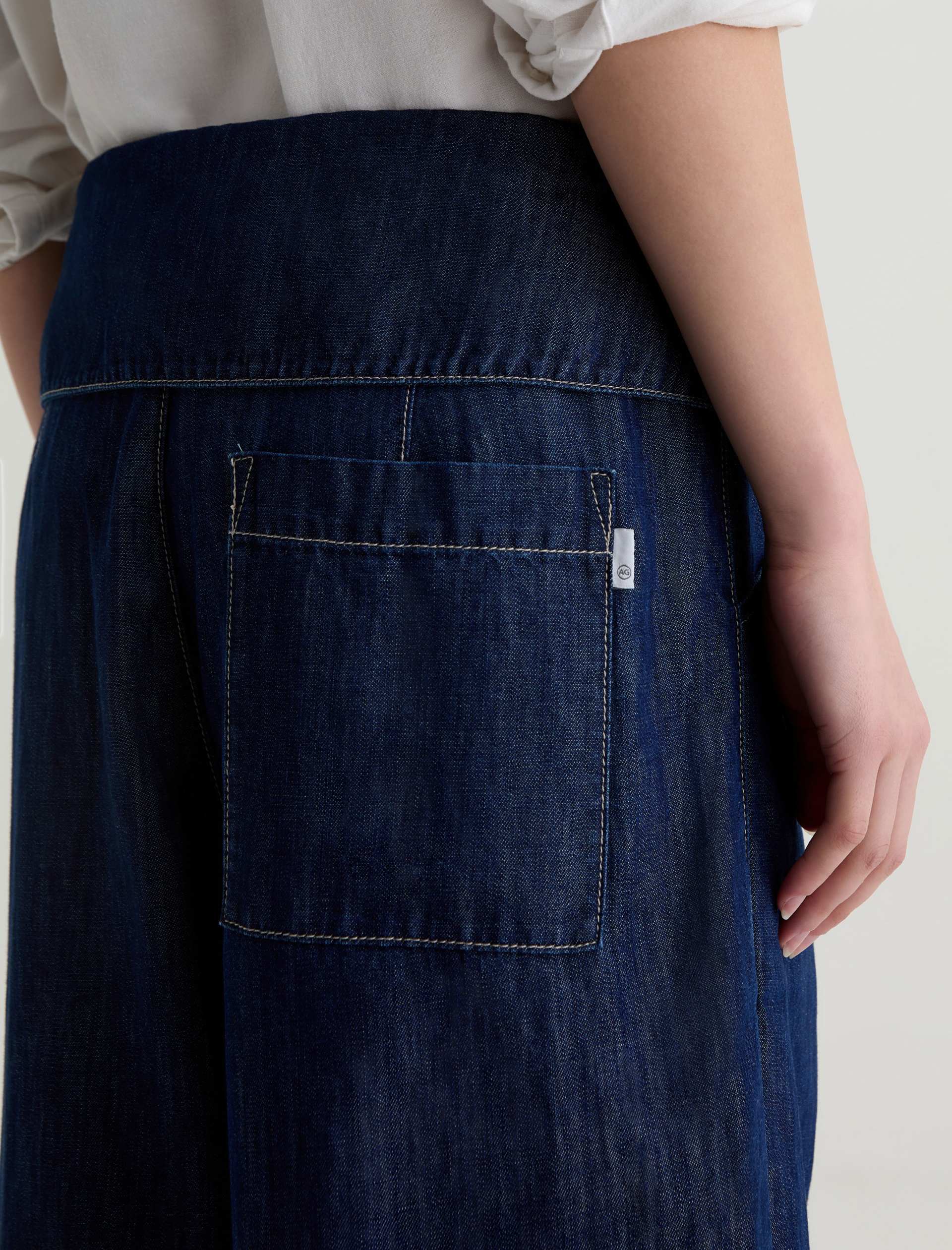 Shelvy is a Thai-inspired fisherman-style pant in Scarlett Irisblue Chambray, a blue wash that brings a relaxed, lived-in feel. Designed with a 26" inseam, it features a drawcord channel with a wide self-tie, a fold-over waistband, and a wide-turned hem for a relaxed yet polished look. Crafted for warm-weather lounging