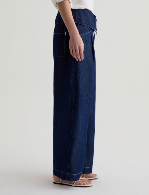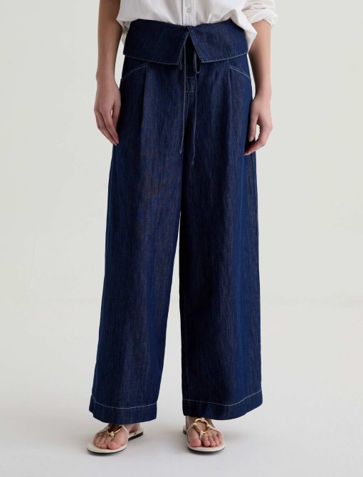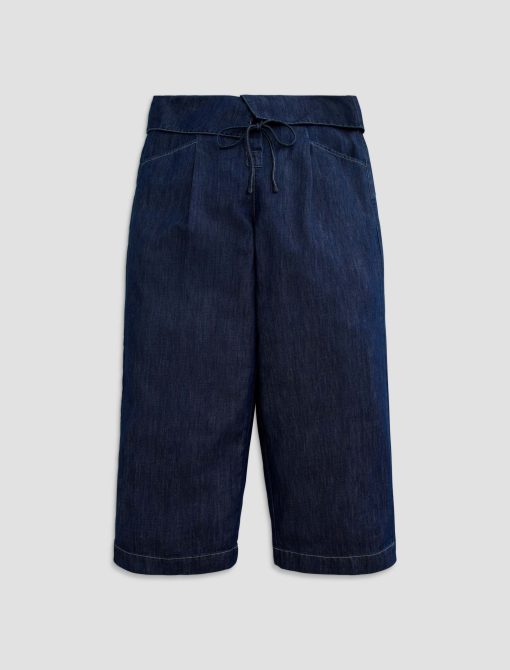 Shelvy is a Thai-inspired fisherman-style pant in Scarlett Irisblue Chambray, a blue wash that brings a relaxed, lived-in feel. Designed with a 26" inseam, it features a drawcord channel with a wide self-tie, a fold-over waistband, and a wide-turned hem for a relaxed yet polished look. Crafted for warm-weather lounging